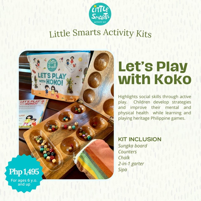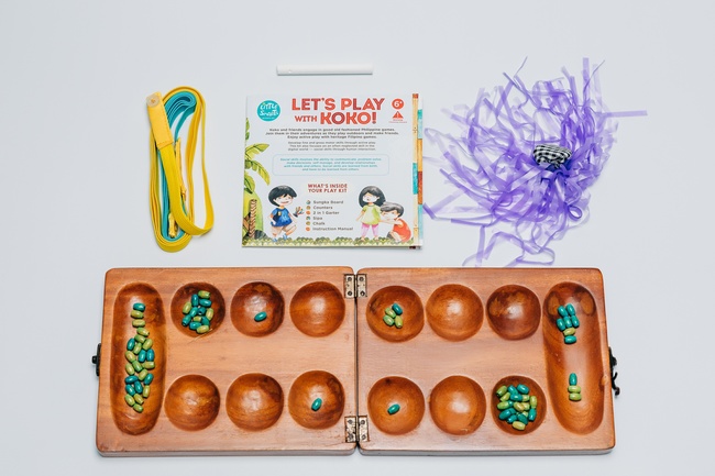 Let’s Play with Koko highlights social skills through active play. Children develop strategies and improve their mental and physical health while learning and playing heritage Philippine games. The play kit includes a sungka board, counters, chalk, 2-in-1 garter, sipa and manual.